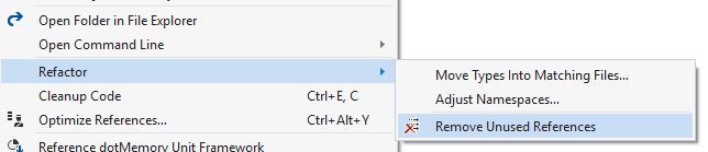 Instead of opening the Nuget Packagemanager and uninstalling things manually there is faster way: right click on the project in the Solution Explorer and go into R# Refactor menu. There you’ll find the Remove unused references menu item.