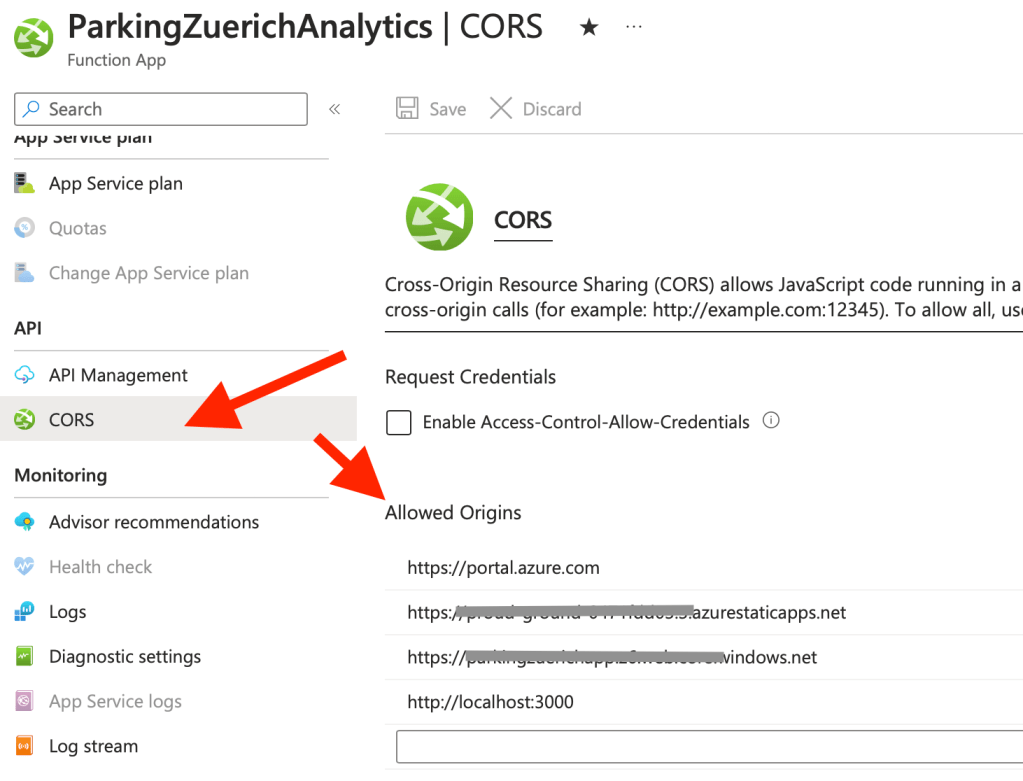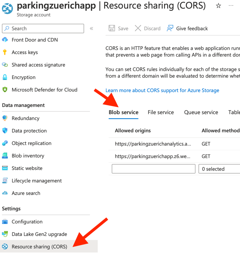 In the blob storage (static website) there are CORS headers too. You’ll find it under “Resource Sharing (CORS)”. Add the URL / domain of your Azure Functions backend in there.